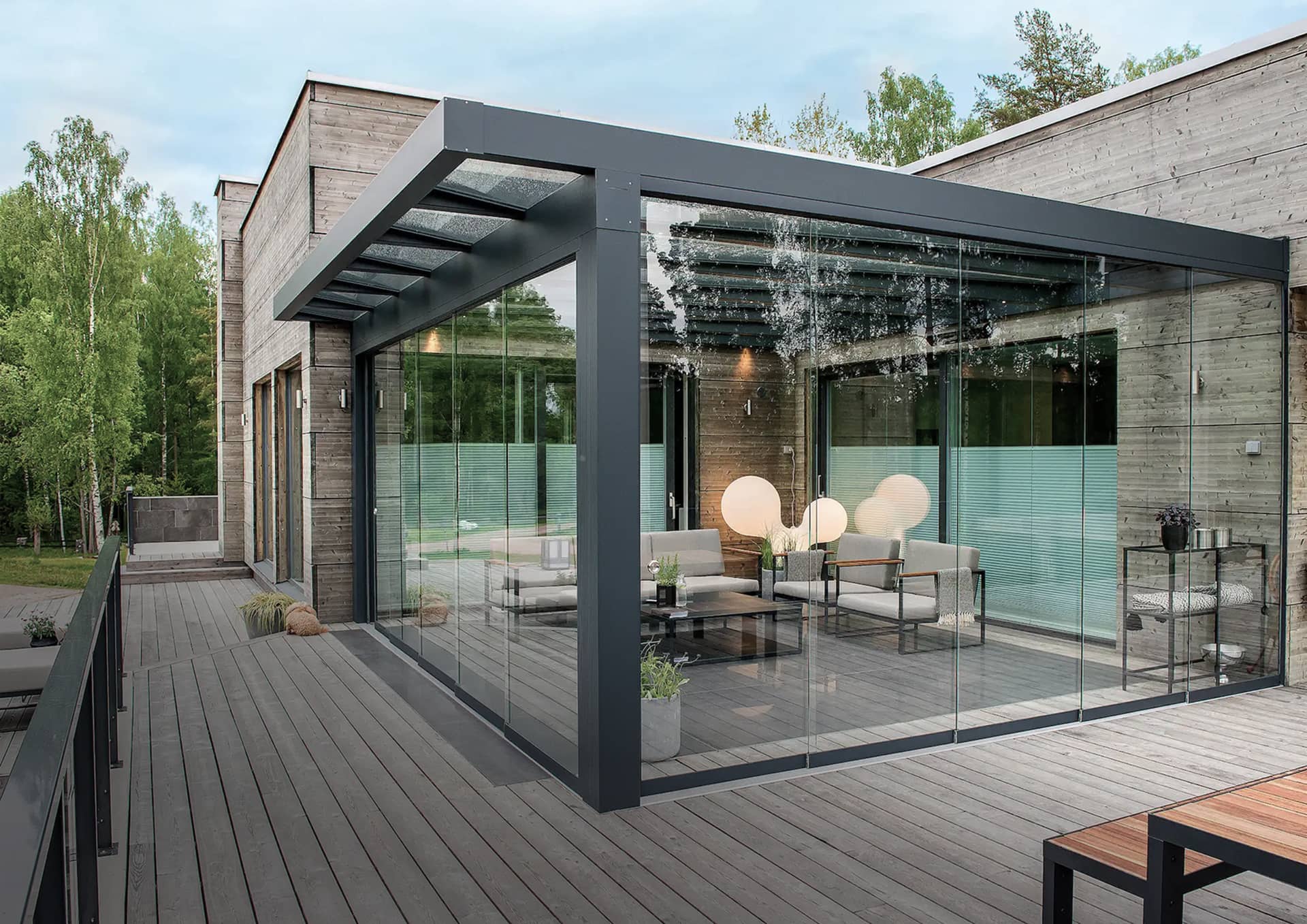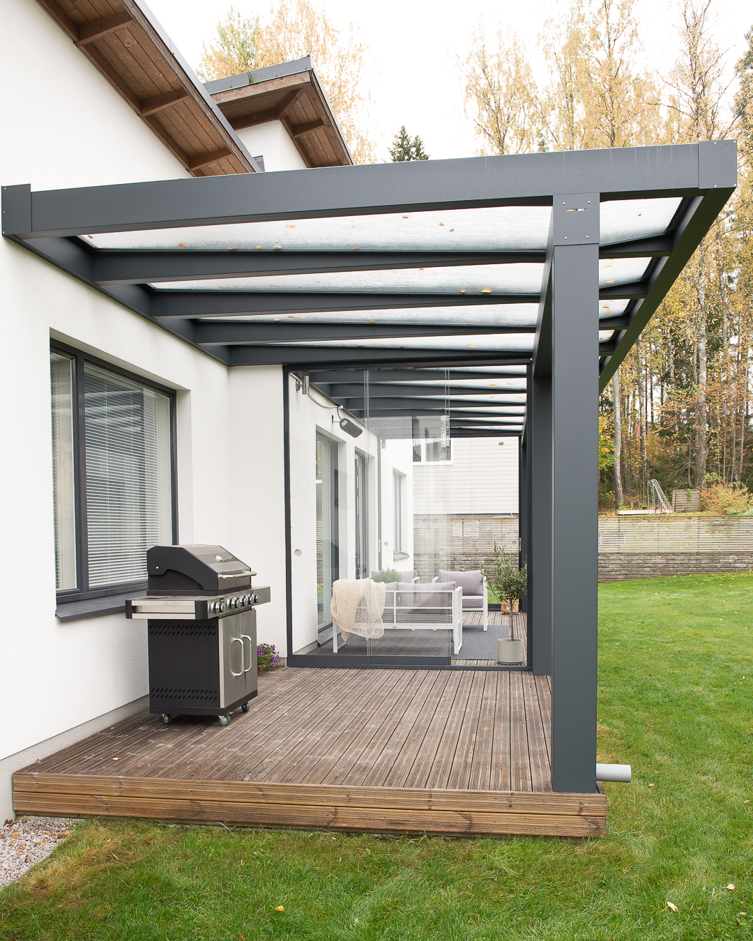 Sadevedet ohjataan hallitusti kattopalkkien väliin kaltevasti asennettuja kattolaseja pitkin etupalkkiin ja edelleen etutolppien sisäosaan integroituun syöksyputkeen – tyyli ja toiminnallisuus ovat osa Ultraline-malliston vakiovarusteita.
