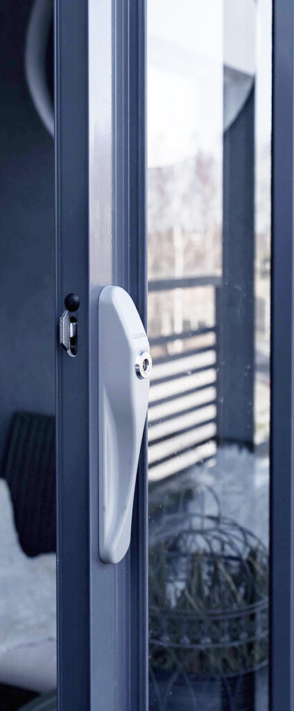 Lasitusjärjestelmä toimitetaan aina karkaistulla turvalasilla lukitusten kanssa. Sisäpuolelle on saatavilla kaksi lukitusvaihtoehtoa: sormilukitus tai vetonuppi. Ulkopuolelle valittavissa Abloy lukko, mikä voidaan tarvittaessa sarjoittaa samaan sarjaan kodin muiden Abloy lukkojen kanssa.