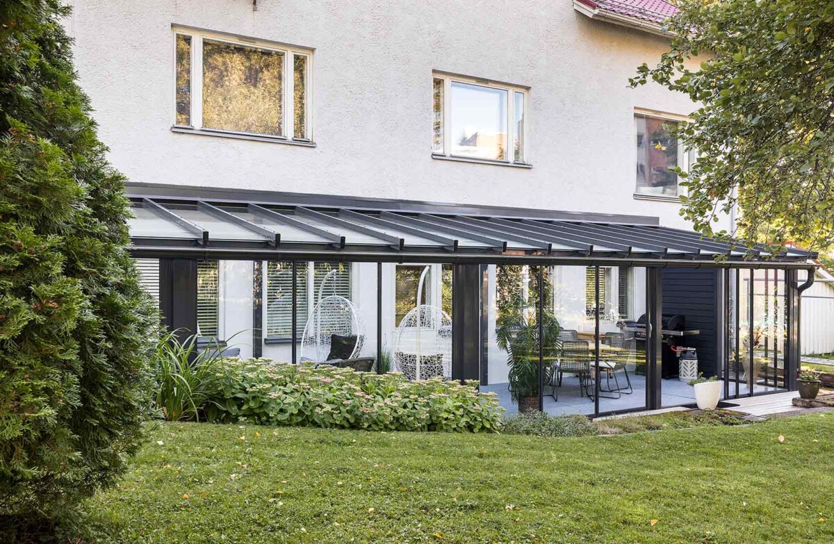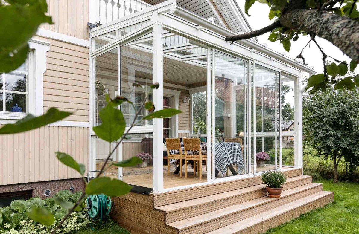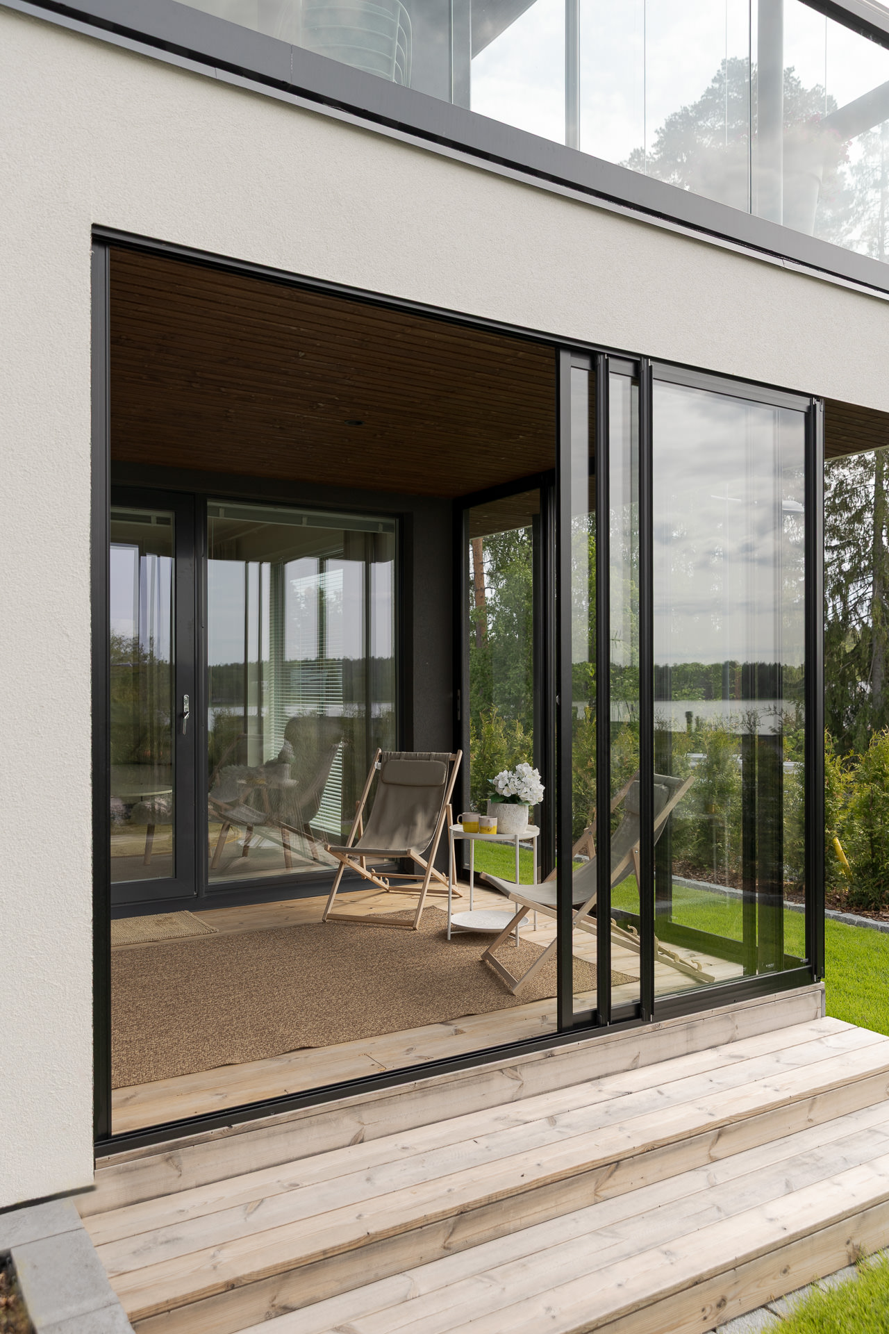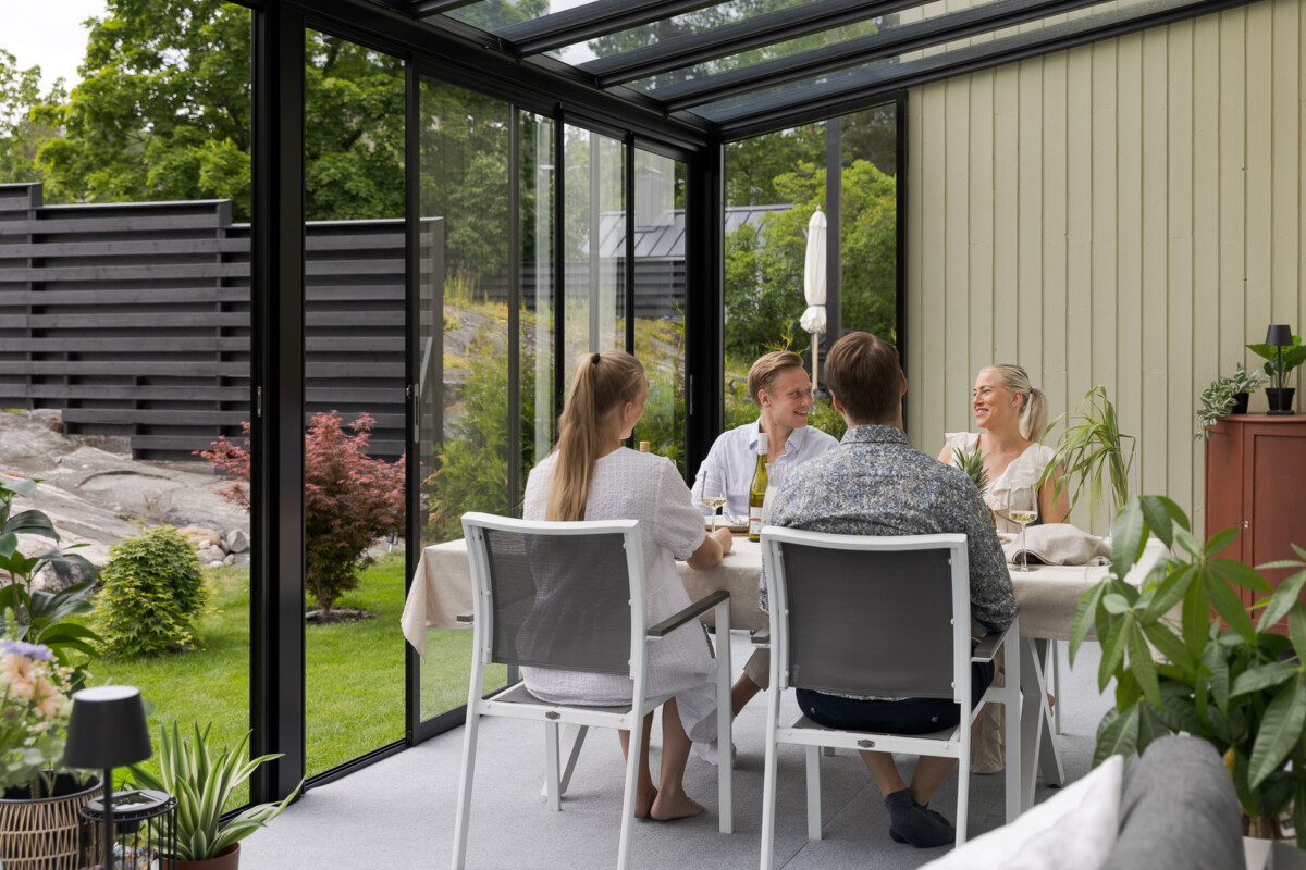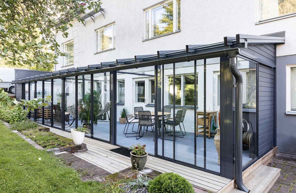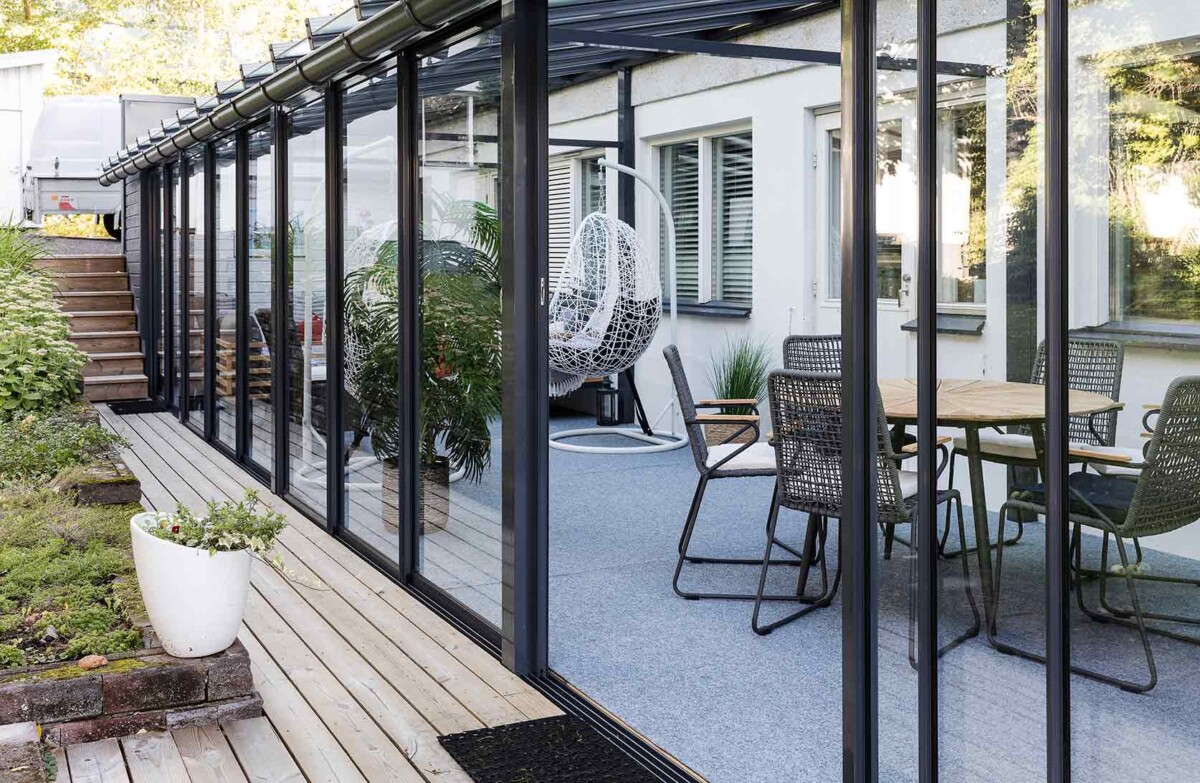 Suljettuna lasitusjärjestelmän lasit ovat ryhdikkäästi vierekkäin ja limittäin omilla raiteellaan, joten lasitettu tila pysyy suojassa sateelta, viimalta ja lumelta. Lasit saa liu’utettua kevyesti ja vaivattomasti toiseen reunaan vierekkäin tai keskeltä reunoille vierekkäin.