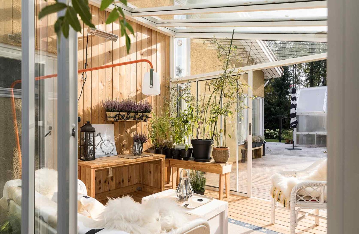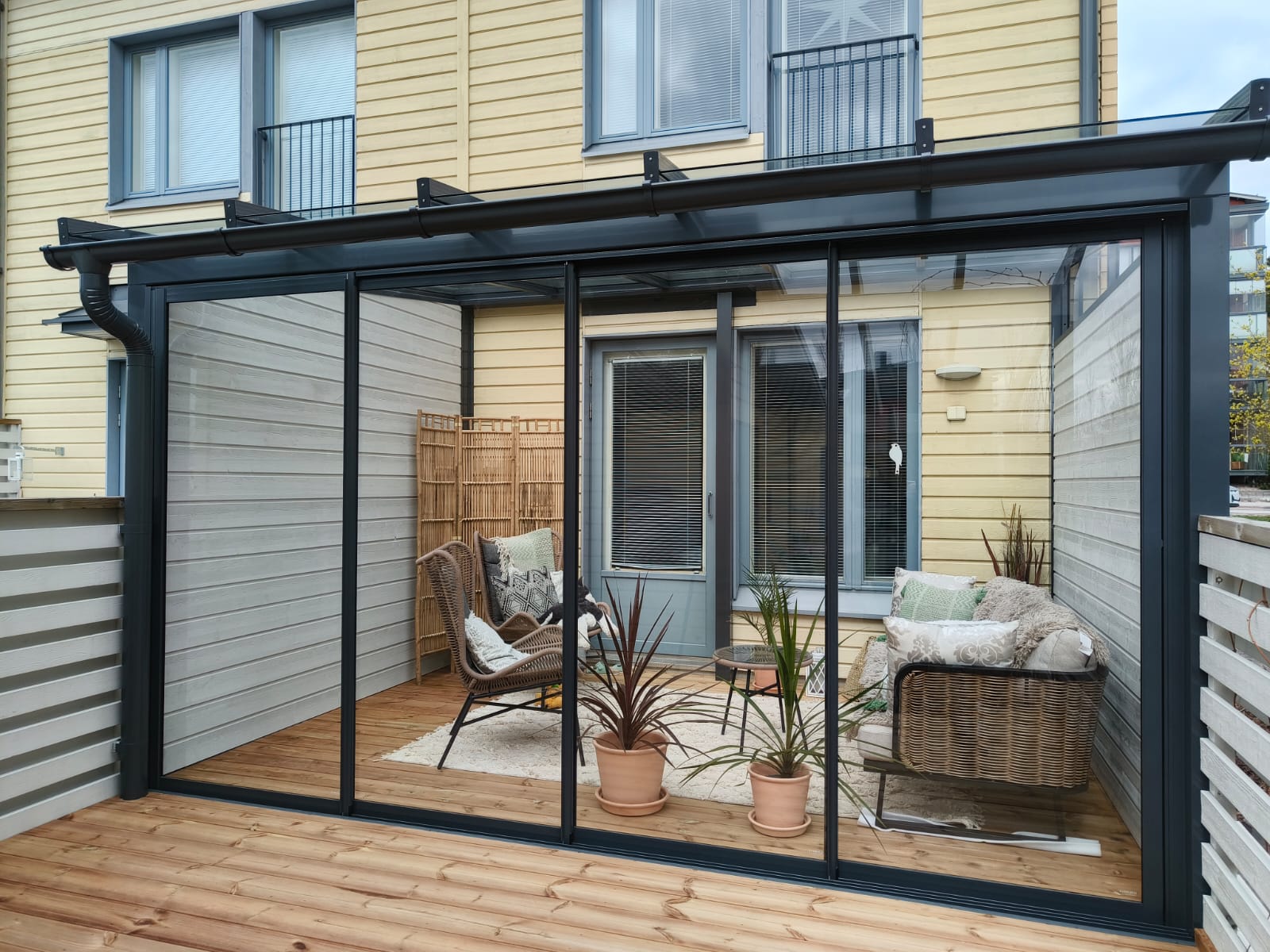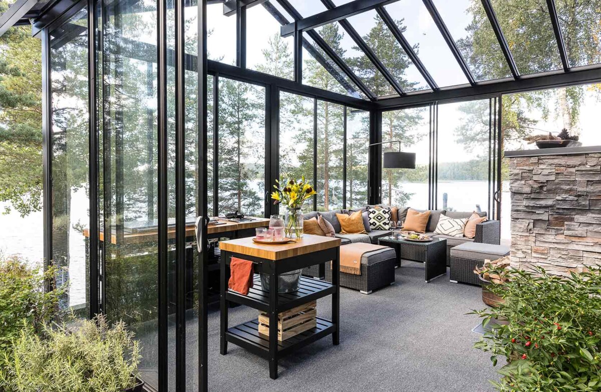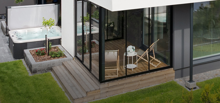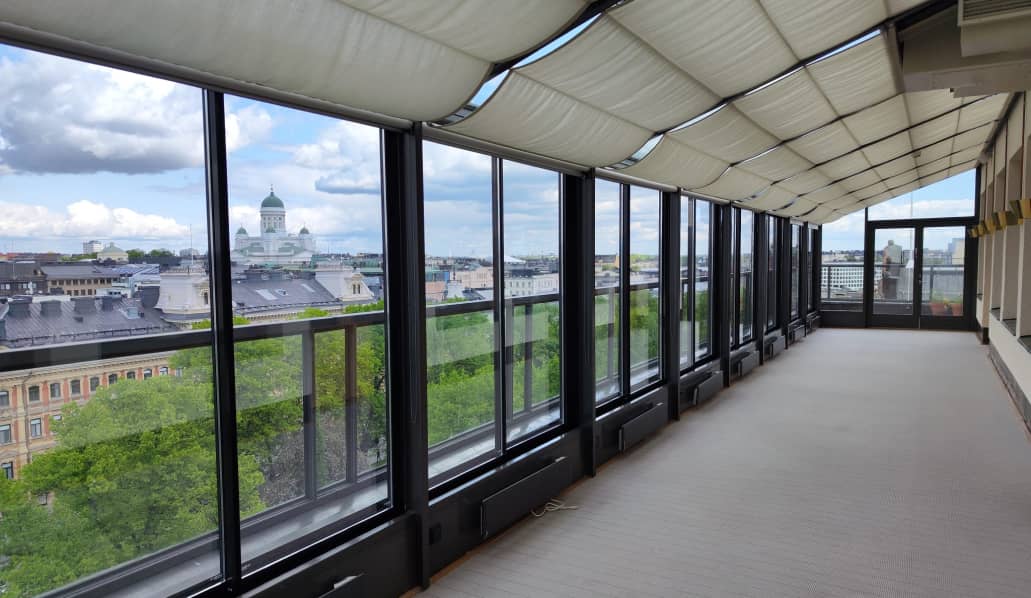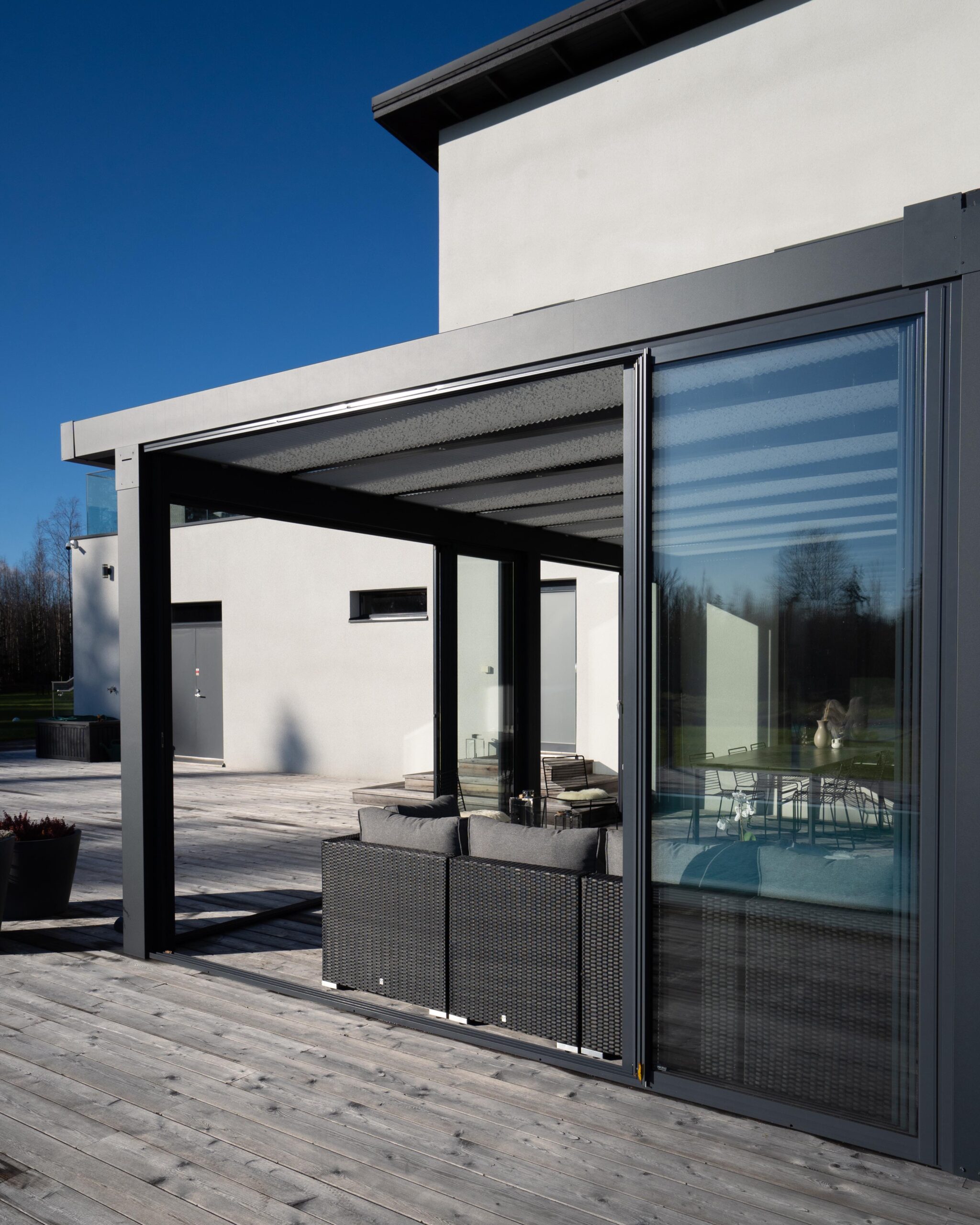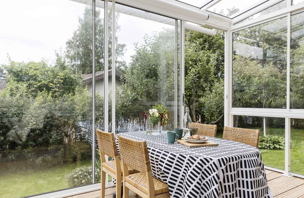 Suljettuna lasitusjärjestelmän lasit ovat ryhdikkäästi vierekkäin ja limittäin omilla raiteellaan, joten lasitettu tila pysyy suojassa sateelta, viimalta ja lumelta. Lasit saa liu’utettua kevyesti ja vaivattomasti toiseen reunaan vierekkäin tai keskeltä reunoille vierekkäin.