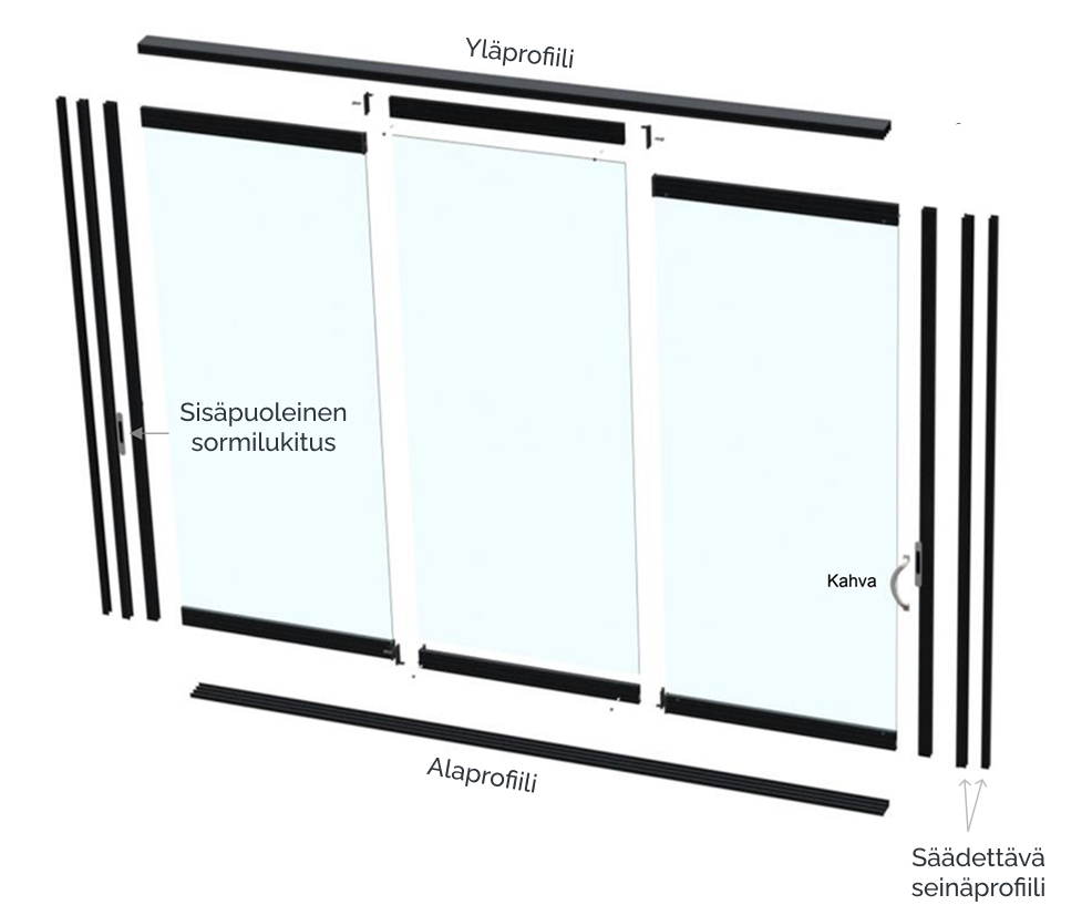 Seinäprofiililla lasitus saadaan asemoitua ja säädettyä aukkoon tarkasti, vaikka aukon seinä ei olisikaan täysin suora. Lasitusjärjestelmään on valittavissa myös jämäkkä pystysuuntainen kahva sekä lasinvälitiivisteet.