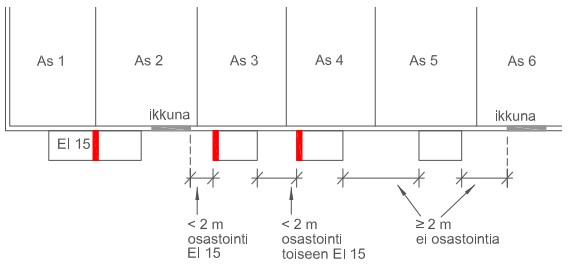 Mikäli lasitettavien ulkotilojen välinen etäisyys on alle 2 metriä tai lasitettavan ulkotilan etäisyys ulkoseinällä olevaan toisen palo-osaston ikkunaan tai oveen on alle 2 metriä on lasitettava ulkotila osastoitava EI 15 rakentein.